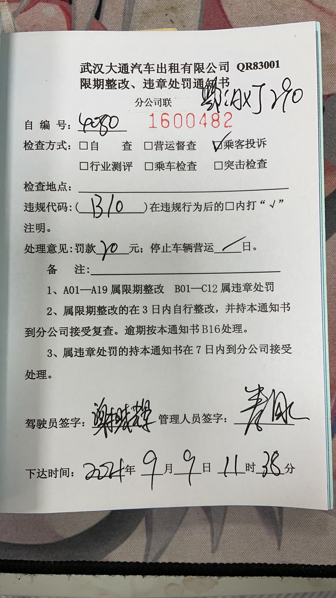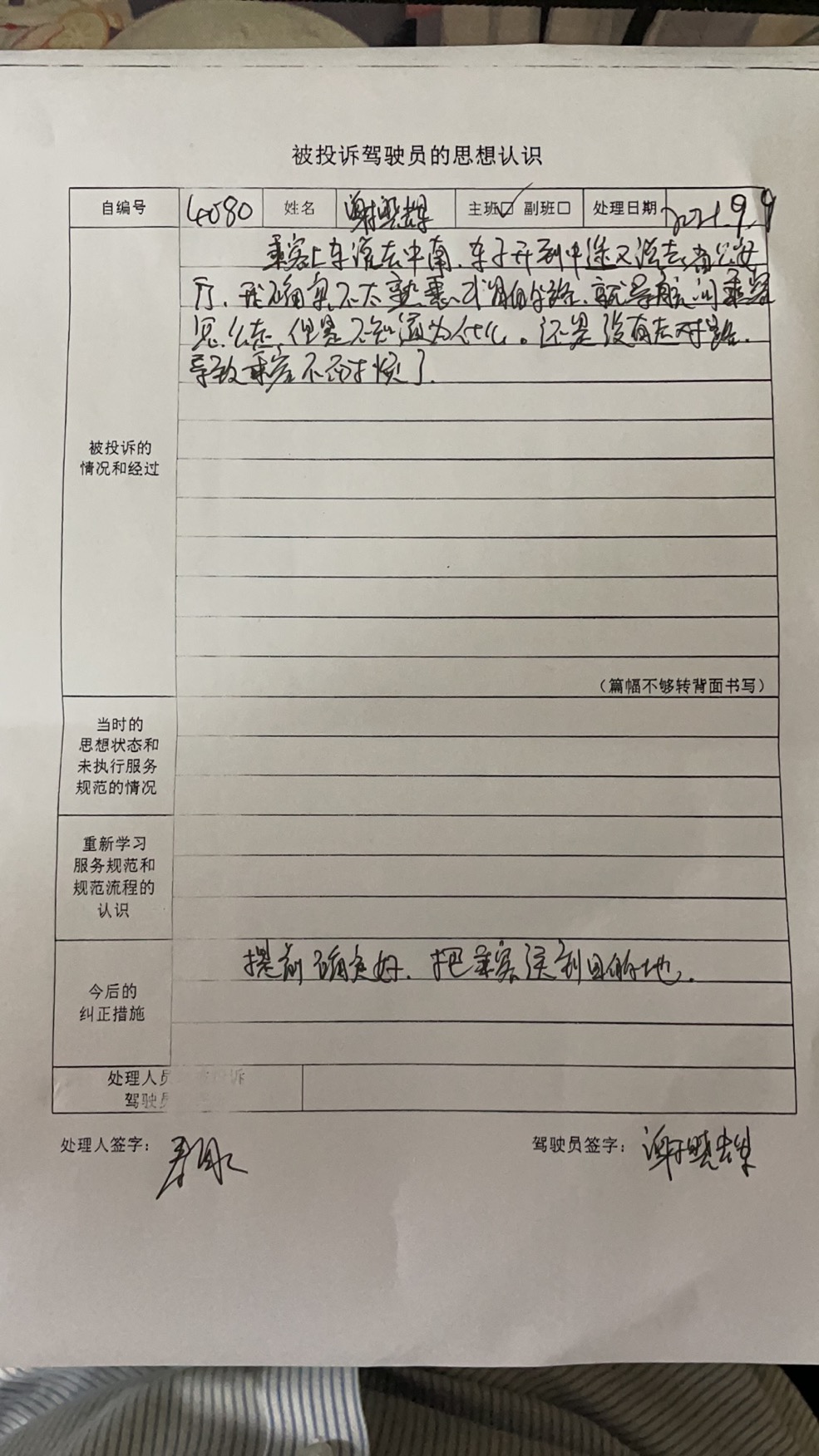 | 乘客对处理的意见: |